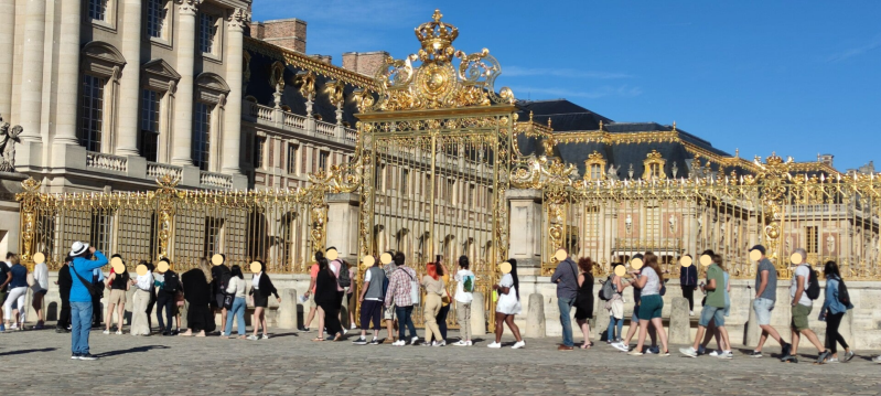 Sur les coups de 8H30, nous avons filé après avoir effectué un repérage la veille et nous nous sommes présentés aux portes principales de Versailles où le monde commençait à affluer. Par chance, je prévois toujours nos voyages à l'avance (Mme Organisation, c'est moi !) ce qui fait qu'une fois notre file d'attente entamée, on n'avait plus qu'à passer les portes de sécurité et nous étions lâchés dans le Château de Versailles...